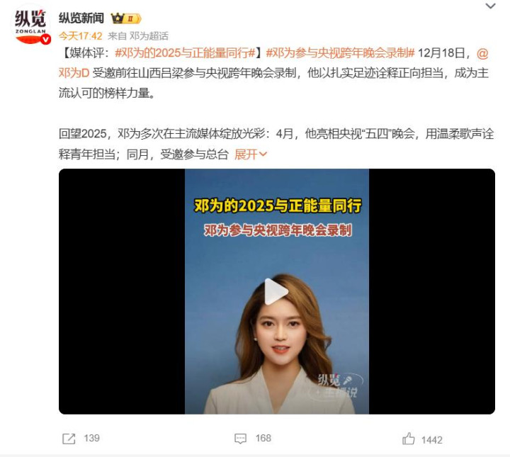 这次再度登上央视跨年舞台,邓为的扮演曲目成为全网推测的焦点,令东说念主不测的是,曾堕入“假唱风云”的宋威龙也出目下录制名单中,央视怡悦向这位年青艺东说念主递出橄榄枝,或者恰是看中了他的成长后劲。