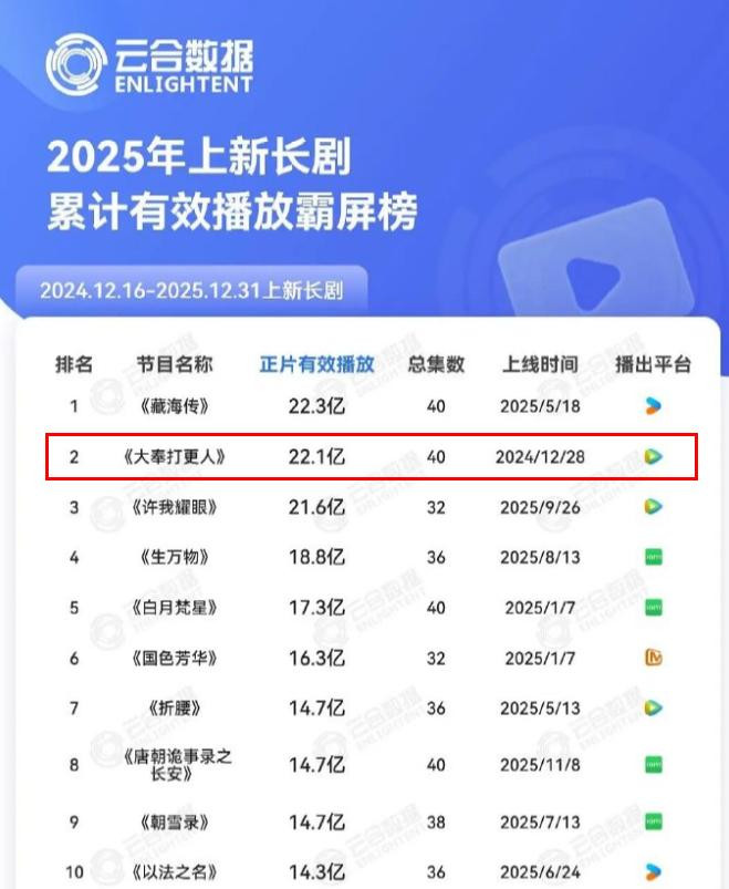 《大奉击柝东谈主》迎来大结局后,有许多网友都在“朝笑”王鹤棣,毕竟《大奉击柝东谈主》取得的收货不睬念念,但这部剧真是莫得取得亮眼的收货吗?近日,官方发出2025年上新长剧积存有用播放霸屏榜,共有20部电视剧入选。