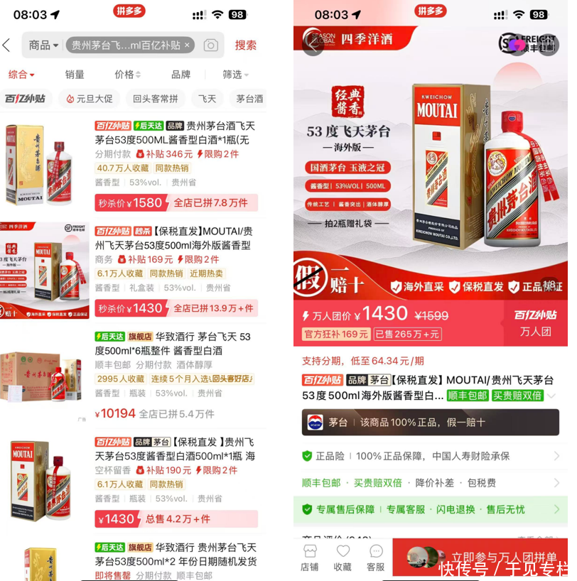 事实上,线上渠谈的廉价信号更早出现。此前在拼多多“百亿补贴”专区,53度飞天茅台曾降至1399元/瓶,但由于白酒破费的中枢场景团结在线下宴请、礼品馈送等领域,彼时线上廉价更多是局部促销行为,对全体市集价钱体系的冲击相对有限。