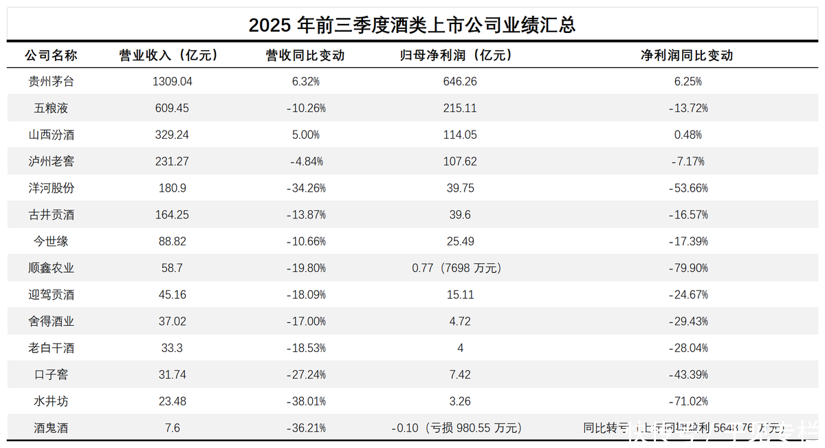 茅台的功绩承压并非个例,2025年Q3通盘白酒行业交出了“史上最差功绩”。A股20家白酒上市公司中,18家功绩大幅下滑——五粮液Q3营收、净利润双双腰斩;洋河股份Q3净示寂达3.69亿元;口子窖、水井坊等区域酒企单季净利润降幅更是稀零70%,头部与区域酒企集体堕入增长失速的窘境。